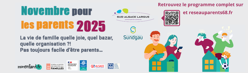Tout au long du mois de novembre, le Réseau Parents 68, ses partenaires et les Communautés de communes Sundgau et Sud Alsace Largue vous proposent un festival d’idées pour mieux vivre la vie de famille : des rencontres entre parents, des ateliers, des conférences avec des professionnels et des journées à partager en famille !..